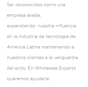 Ser reconocidos como una empresa aliada, expandiendo nuestra influencia en la industria de tecnologia de America Latina manteniendo a nuestros clientes a la vanguardia del exito. En Wholesale Experts queremos ayudarle.